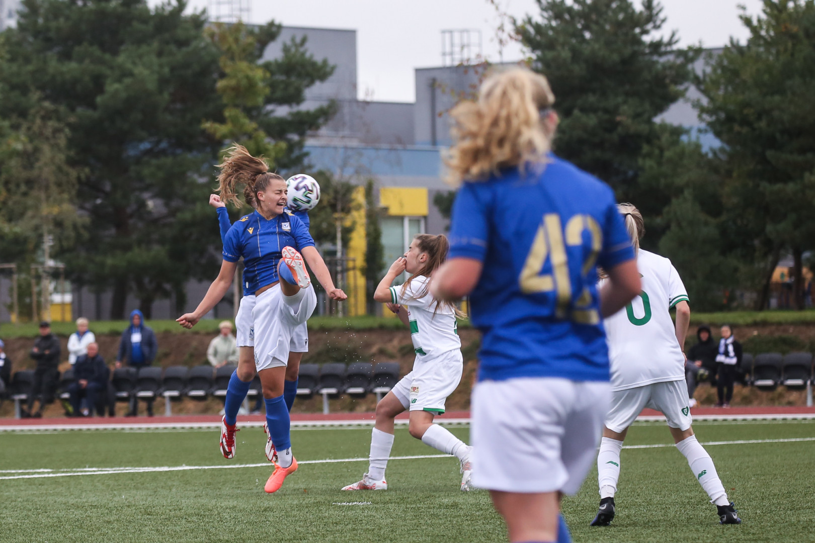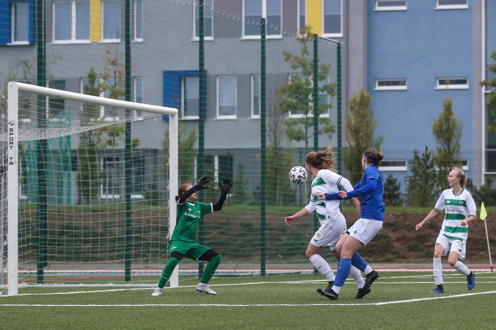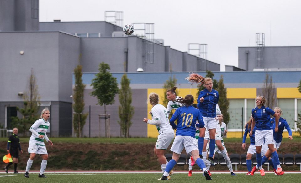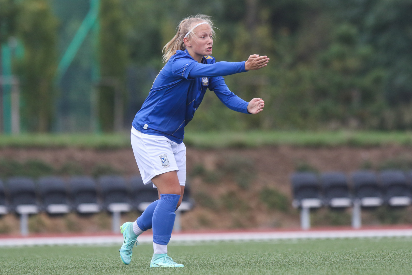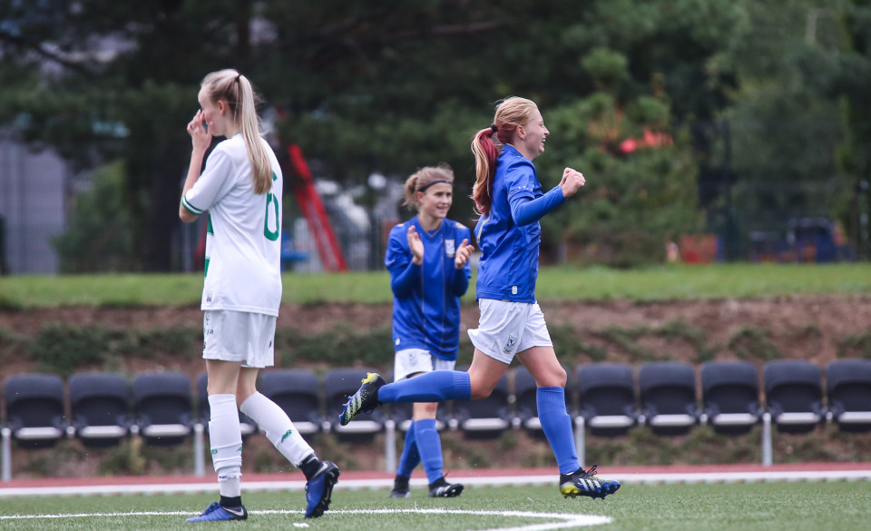 W zespole niebiesko-białych brakowało tym razem liderki defensywy Mai Kuleczki, która jest na zgrupowania reprezentacji Polski do lat 17, a także Pauli Fronczak, która została powołana na towarzyskie gry kadry narodowej w futsalu. Na pozycji środkowej obrończyni Zuzannie Sawickiej towarzyszyła kapitan drużyny, Zofia Mager. Obie były bardzo pewnymi punktami ekipy, która rozpoczęła nieco nerwowo, ale od pierwszej minuty posiadała inicjatywę. Lechia schowała się na własnej połowie. Rywalki z Trójmiasta dysponowały lepszymi warunkami fizycznymi, ale poznanianki były sprytniejsze i kombinacyjnymi atakami dochodziły do okazji strzeleckich. W ten sposób zresztą objęły prowadzenie, kiedy piłka trafiła na prawej stronie do Martyny Lechny, a ta kapitalnym uderzeniem w stronę dalszego słupka pokonała bramkarkę gości. Napastniczka jest ostatnio w świetnej dyspozycji, bo przed tygodniem wbiła pięć bramek w wyjazdowym starciu z rezerwami Olimpii Szczecin (13:0). Teraz znów była motorem napędowym swojej drużyny.