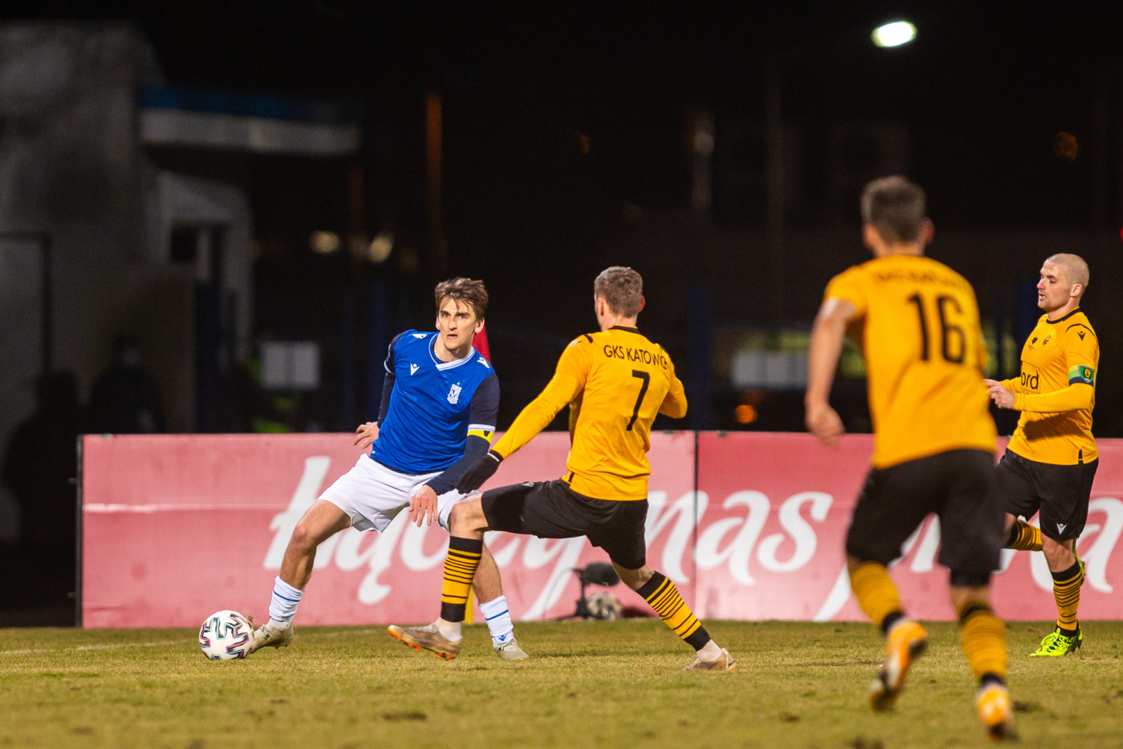 Początek meczu nie mógł być lepszy dla poznaniaków. Łukasz Szramowski po pięknym podaniu Filipa Marchwińskiego wyszedł na czystą pozycję i mocnym uderzeniem w prawy róg bramki strzeżonej przez Bartosza Mrozka dał swojej drużynie prowadzenie. Kilka minut później Krystian Sanocki po krótkim rozegraniu piłki z Marcinem Urynowiczem wpadł w pole karne Lecha, jednak kopnął nad poprzeczką. Niebiesko-biali nie dominowali na boisku. Katowiczanie długimi minutami zamykali lechitów na własnej połowie, a ich stałe fragmenty gry sprawiały dużo problemów obrońcom.