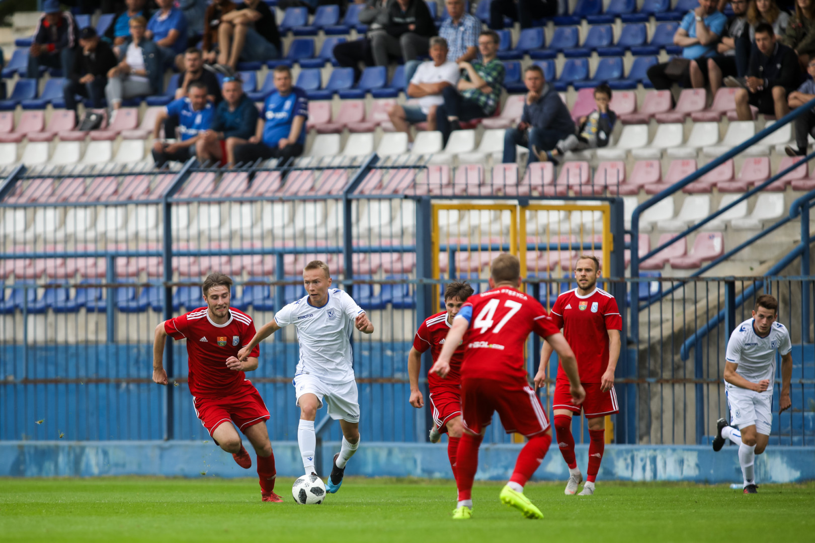 Pierwsze minuty tej konfrontacji upłynęły pod znakiem ostrożnej gry z obu stron. Nie znaczy to jednak, że oglądaliśmy monotonne spotkanie, bo zarówno Kolejorz, jak i przyjezdni starali się przeprowadzać szybkie, efektowne akcje. Ich wysiłki kończyły się z reguły w okolicy pola karnego swojego rywala, więc ani Karol Szymańśki, ani golkiper ze Stężycy nie mieli w tych fragmentach meczu wiele pracy. Mimo to tempo utrzymywało się na dobrym poziomie i mimo ostrych wejść szczególnie ze strony Radunii ten pojedynek oglądało się przyjemnie.