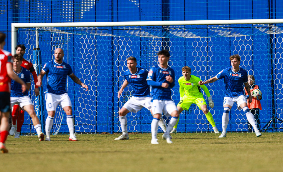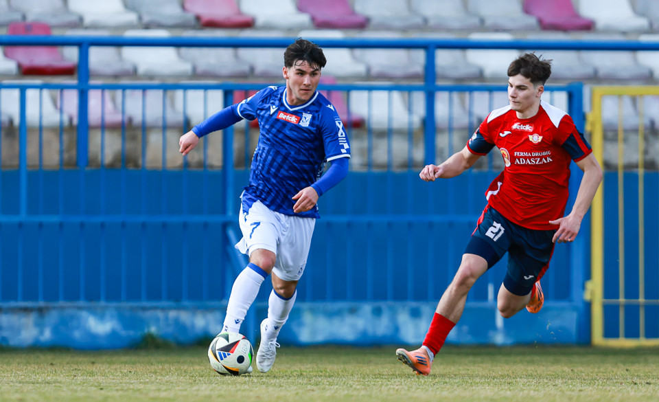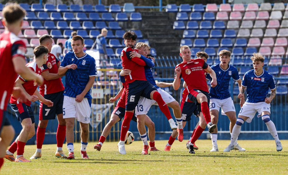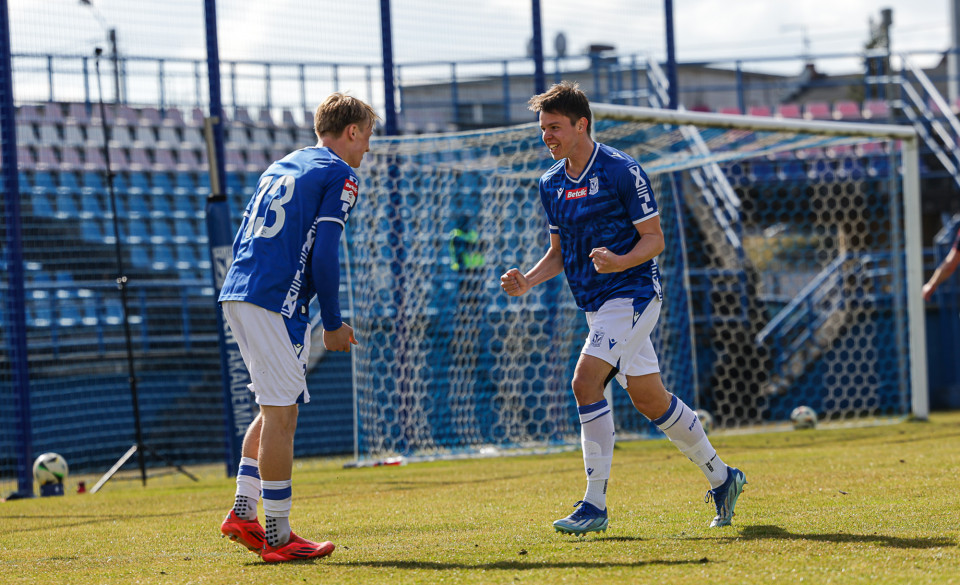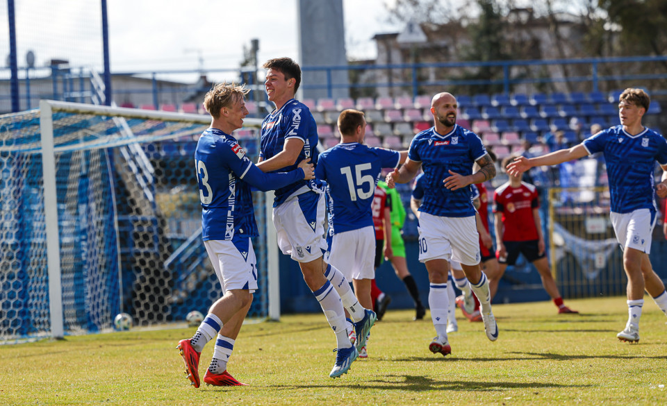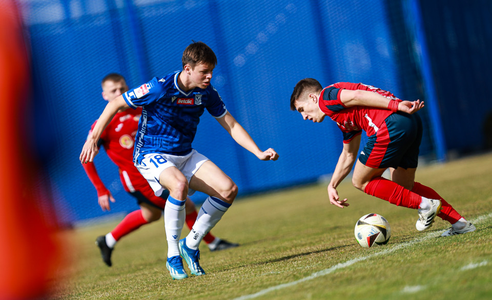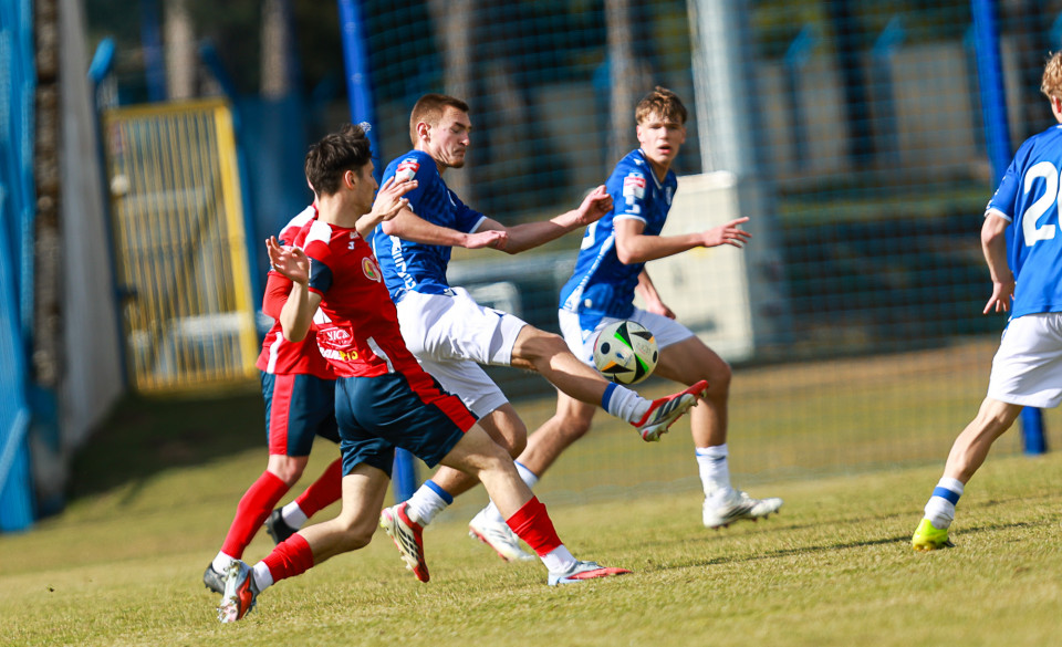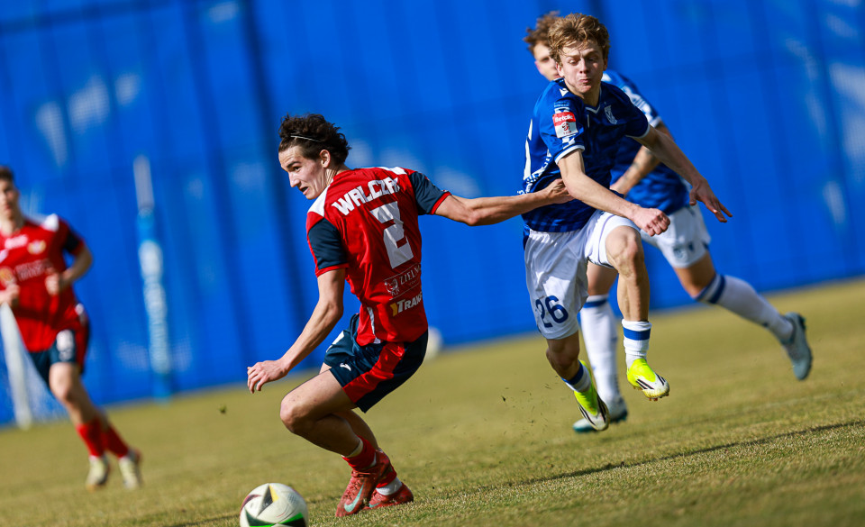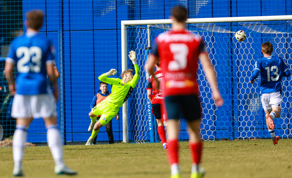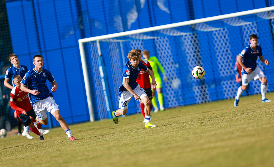 Od pierwszej minuty oglądaliśmy niezwykle żywy mecz na stadionie Akademii. Obie drużyny nastawione były na ofensywę, choć początkowo nie przekładało się to na dobre sytuacje. Goście swoich okazji szukali głównie po stałych fragmentach gry, natomiast Lechici dobrze radzili sobie z piłką przy nodze i próbowali zaskoczyć rywali głównie atakami skrzydłami. Niebiesko-Biali powinni wyjść na prowadzenie w końcówce pierwszej połowy. Artur Pląskowski dobrym podaniem uruchomił Tymoteusz Gmura, który znalazł się oko w oko z Przemysławem Frąckowiakiem. Pomocnik chciał minąć bramkarza, czym wygonił się na skraj pola karnego. 18-latek zdołał podać jeszcze wzdłuż pola karnego do Igora Stankiewicza, a ten wyłożył piłkę do Pląskowskiego. Napastnik oddał strzał po ziemi, lecz skutecznie interweniował Frąckowiak. Golkiper niedługo później popisał się świetną paradą przy mocnym strzale Jakuba Antczaka i tym samym do przerwy nie oglądaliśmy goli.
