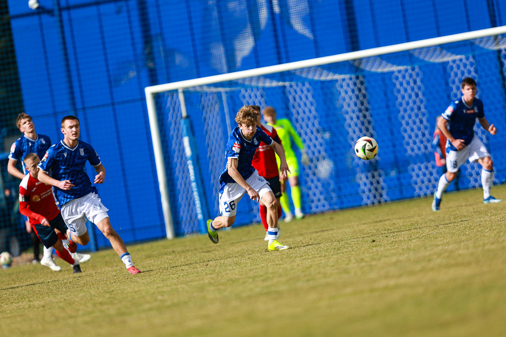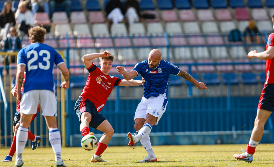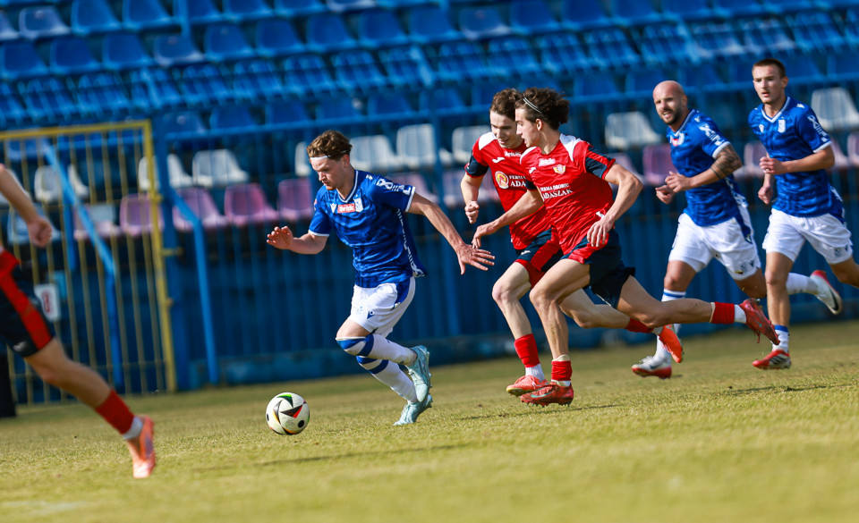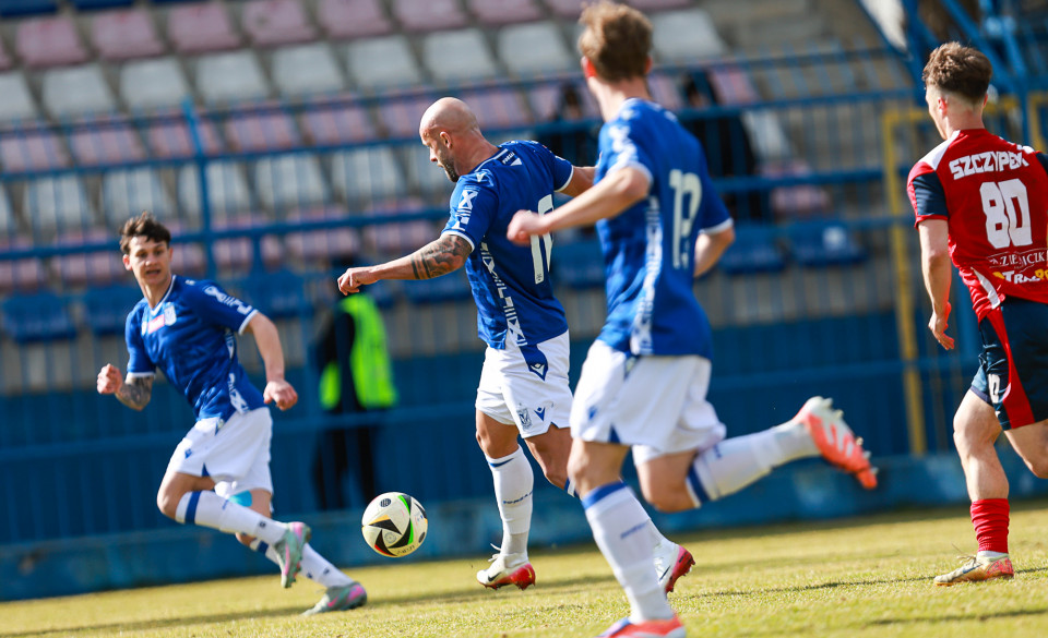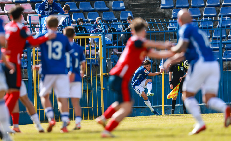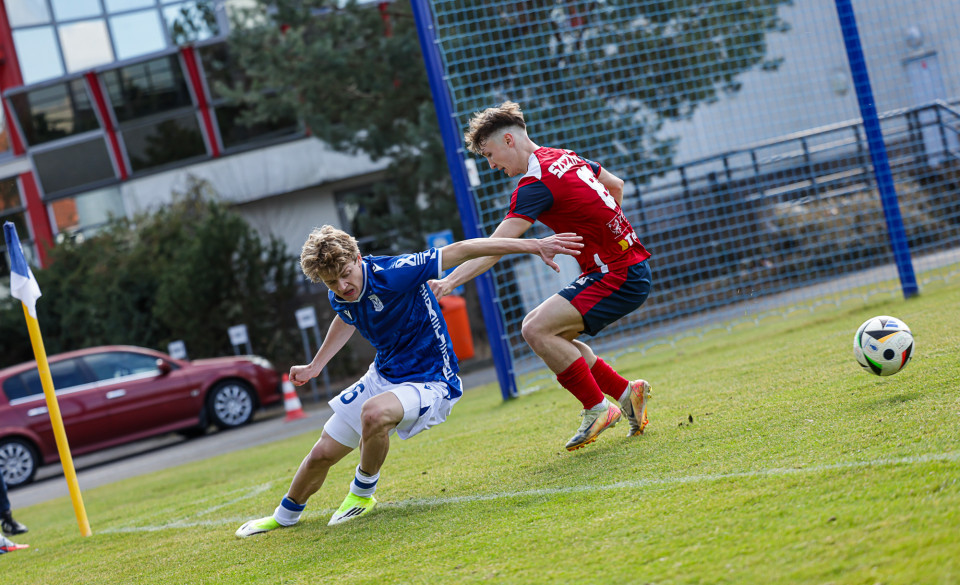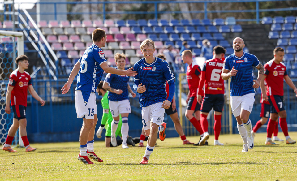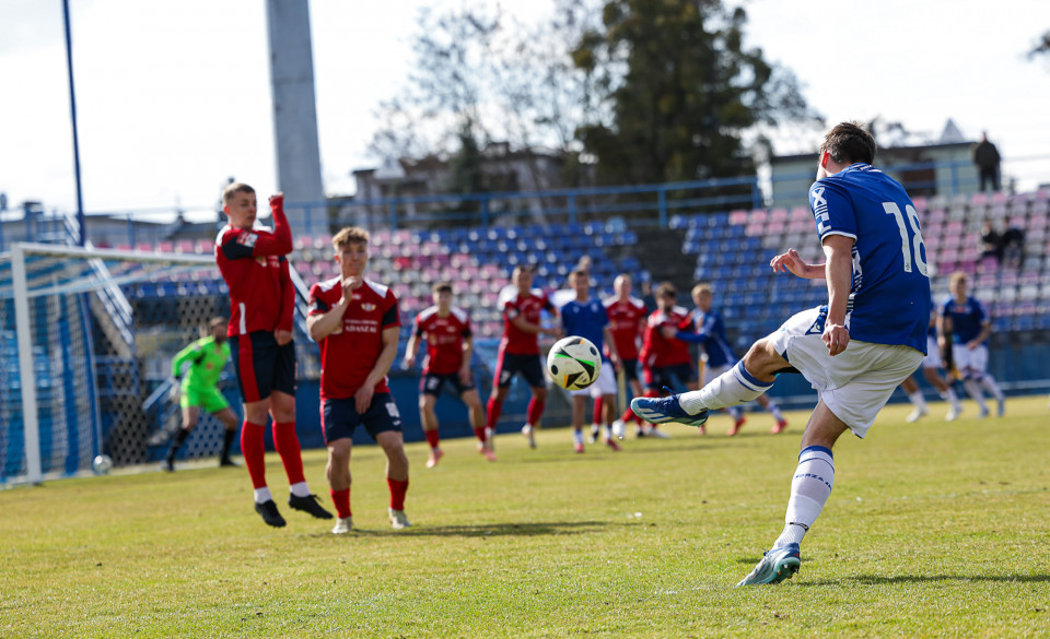 Od pierwszej minuty oglądaliśmy niezwykle żywy mecz na stadionie Akademii. Obie drużyny nastawione były na ofensywę, choć początkowo nie przekładało się to na dobre sytuacje. Goście swoich okazji szukali głównie po stałych fragmentach gry, natomiast Lechici dobrze radzili sobie z piłką przy nodze i próbowali zaskoczyć rywali głównie atakami skrzydłami. Niebiesko-Biali powinni wyjść na prowadzenie w końcówce pierwszej połowy. Artur Pląskowski dobrym podaniem uruchomił Tymoteusz Gmura, który znalazł się oko w oko z Przemysławem Frąckowiakiem. Pomocnik chciał minąć bramkarza, czym wygonił się na skraj pola karnego. 18-latek zdołał podać jeszcze wzdłuż pola karnego do Igora Stankiewicza, a ten wyłożył piłkę do Pląskowskiego. Napastnik oddał strzał po ziemi, lecz skutecznie interweniował Frąckowiak. Golkiper niedługo później popisał się świetną paradą przy mocnym strzale Jakuba Antczaka i tym samym do przerwy nie oglądaliśmy goli.
