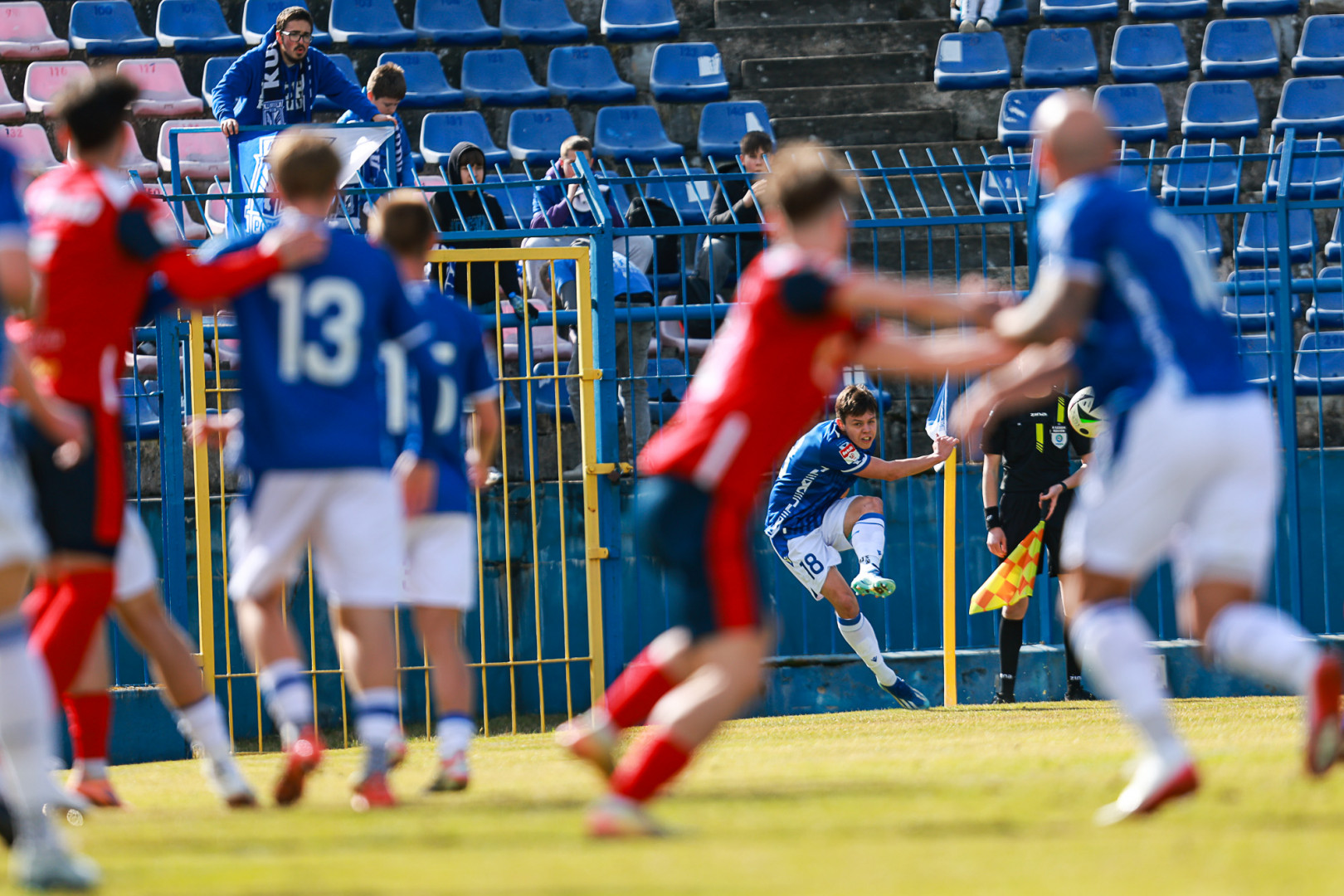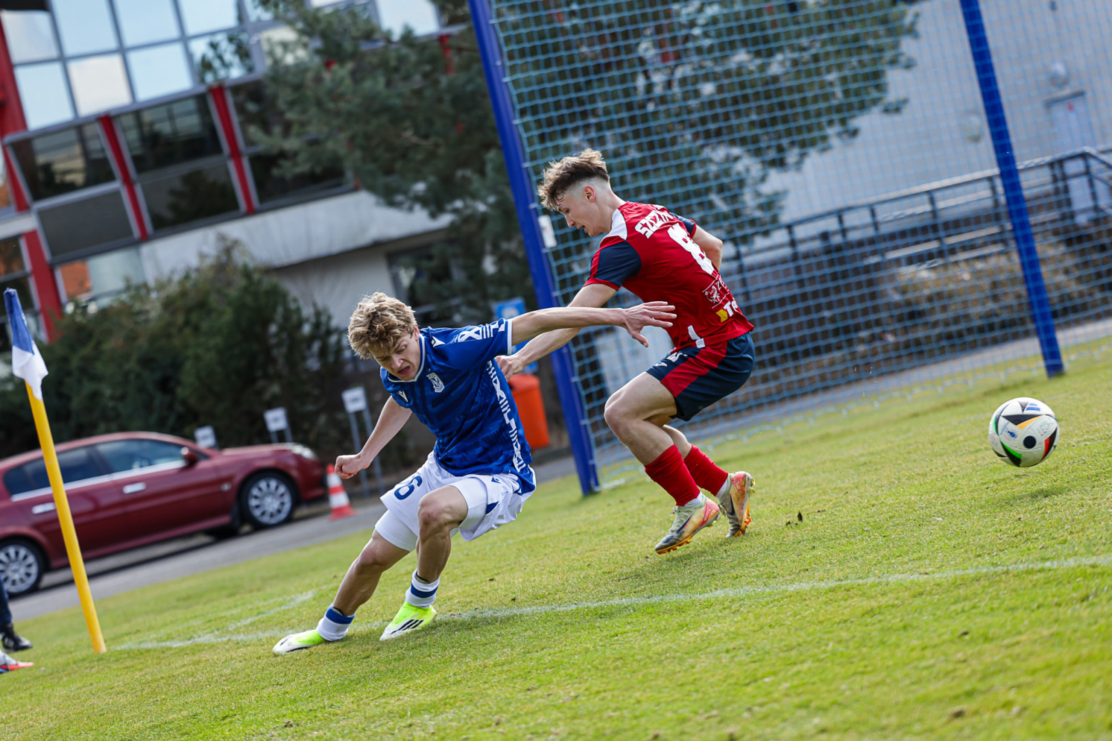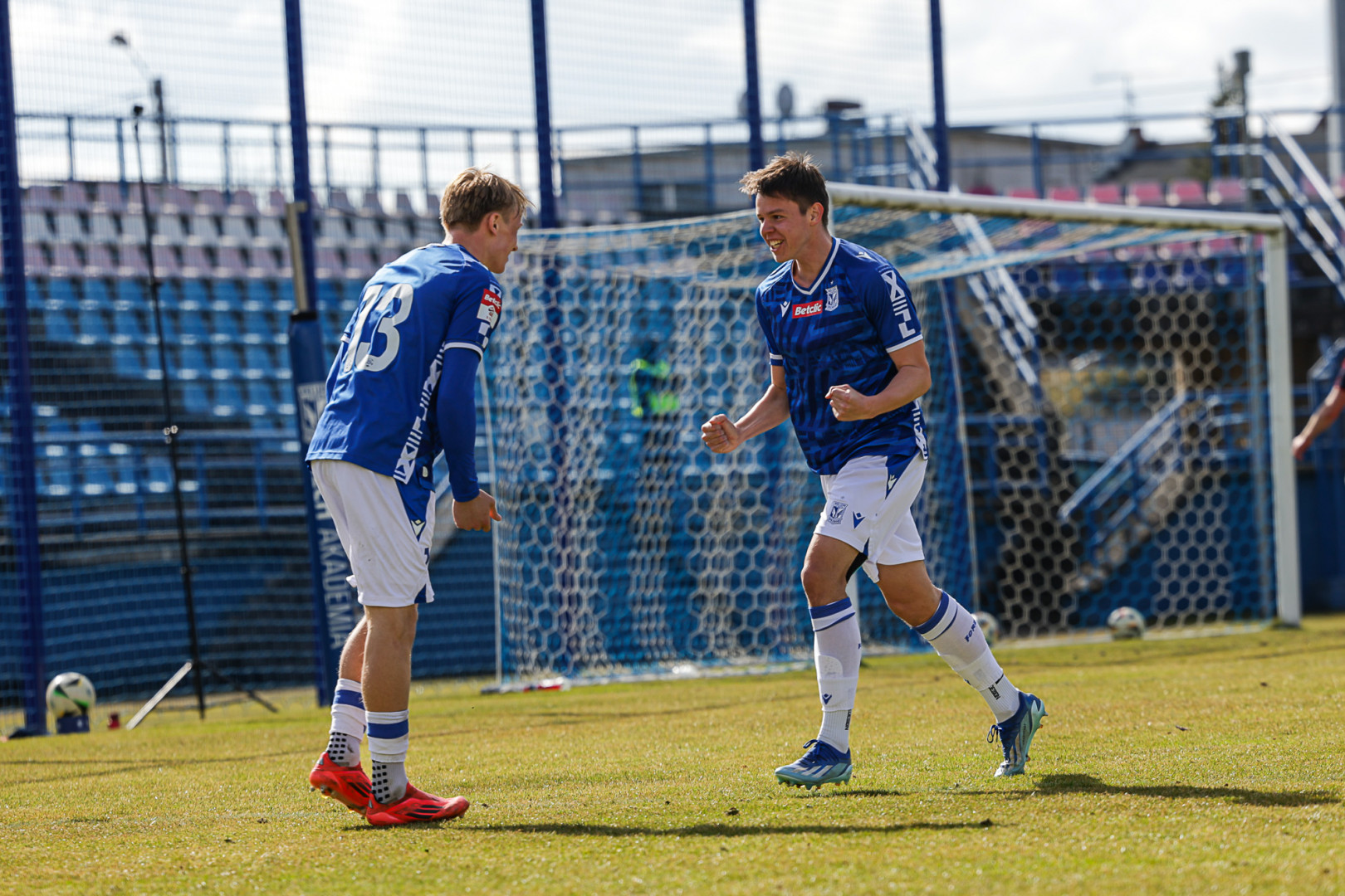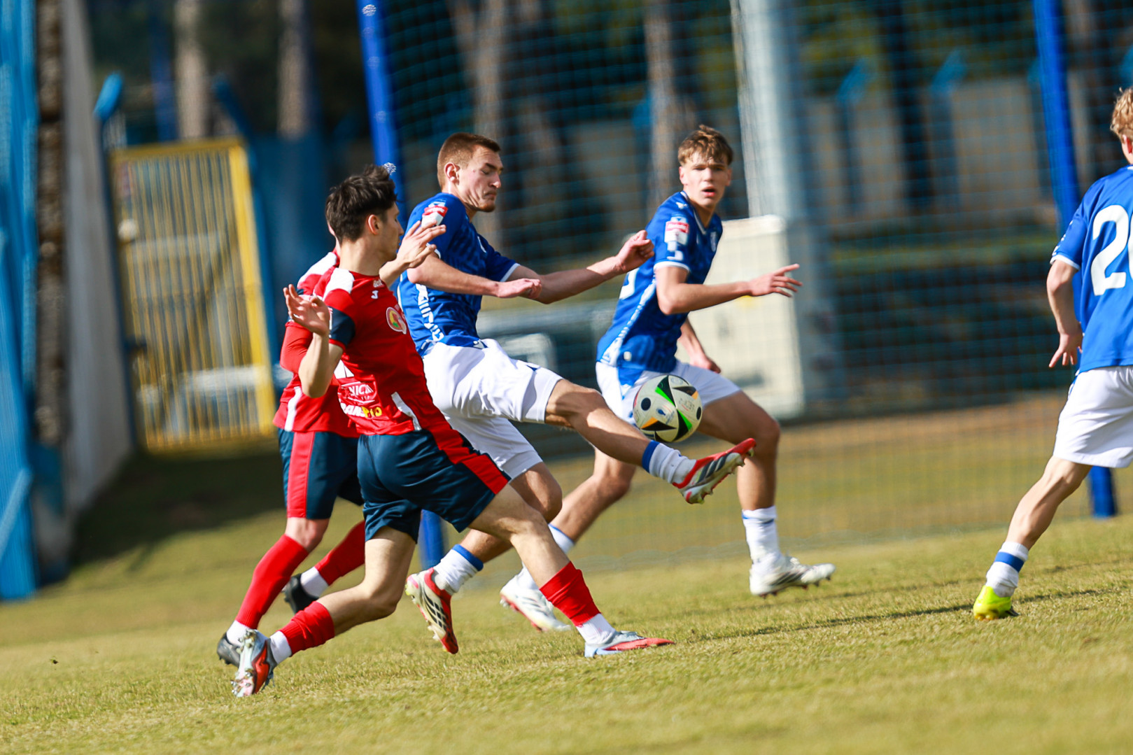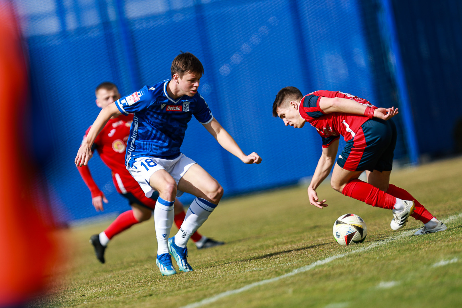 Od pierwszej minuty oglądaliśmy niezwykle żywy mecz na stadionie Akademii. Obie drużyny nastawione były na ofensywę, choć początkowo nie przekładało się to na dobre sytuacje. Goście swoich okazji szukali głównie po stałych fragmentach gry, natomiast Lechici dobrze radzili sobie z piłką przy nodze i próbowali zaskoczyć rywali głównie atakami skrzydłami. Niebiesko-Biali powinni wyjść na prowadzenie w końcówce pierwszej połowy. Artur Pląskowski dobrym podaniem uruchomił Tymoteusz Gmura, który znalazł się oko w oko z Przemysławem Frąckowiakiem. Pomocnik chciał minąć bramkarza, czym wygonił się na skraj pola karnego. 18-latek zdołał podać jeszcze wzdłuż pola karnego do Igora Stankiewicza, a ten wyłożył piłkę do Pląskowskiego. Napastnik oddał strzał po ziemi, lecz skutecznie interweniował Frąckowiak. Golkiper niedługo później popisał się świetną paradą przy mocnym strzale Jakuba Antczaka i tym samym do przerwy nie oglądaliśmy goli.