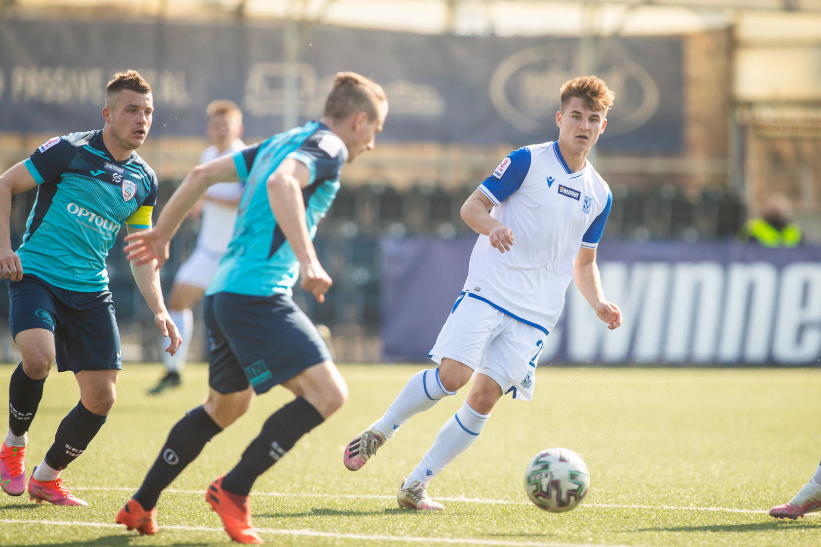 I tak jednak goście potrzebowali dobry kwadrans, żeby przyzwyczaić się do warunków. Starali się jednak grać bardzo dojrzale dyrygowani przez dwójkę doświadczonych piłkarzy: Grzegorza Wojtkowiaka, który jedyny raz na wiosnę pojawił się w jedenastce przeciwko Górnikowi Polkowice (0:4), a także Adriana Laskowskiego. Obaj starali się spokojnie i starannie rozgrywać piłkę na własnej połowie, a pomagał im w tym dzielnie Maksymilian Pingot, który odważnie starał się wprowadzać futbolówkę do gry dłuższymi podaniami. Po jednym z nich zresztą lechici mieli stuprocentową sytuację - Jakub Karbownik uciekł obrońcy, wbiegł z boku w pole karne i miał przed sobą tylko bramkarza, który z opresji zdołał wyjść obronną ręką.