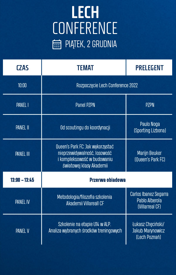 Na trzynastą edycję Lech Conference złoży się pięć prelekcji o zróżnicowanym charakterze. Oprócz panelu Polskiego Związku Piłki Nożnej uczestnicy konferencji staną przed szansą pogłębienia swojej wiedzy z takich zagadnień jak skauting młodzieżowy, identyfikacja talentu, metodologia szkolenia na Półwyspie Iberyjskim czy w Akademii Lecha Poznań i budowa nowoczesnej, w pełni profesjonalnej szkoły piłkarskiej. Jedna z najbardziej prestiżowych imprez organizowanych co roku przez Kolejorza ugości wykładowców z największych europejskich akademii, w tym… przedstawicieli niedawnego przeciwnika niebiesko-białych z fazy grupowej Ligi Konferencji Europy, Villarreal CF.