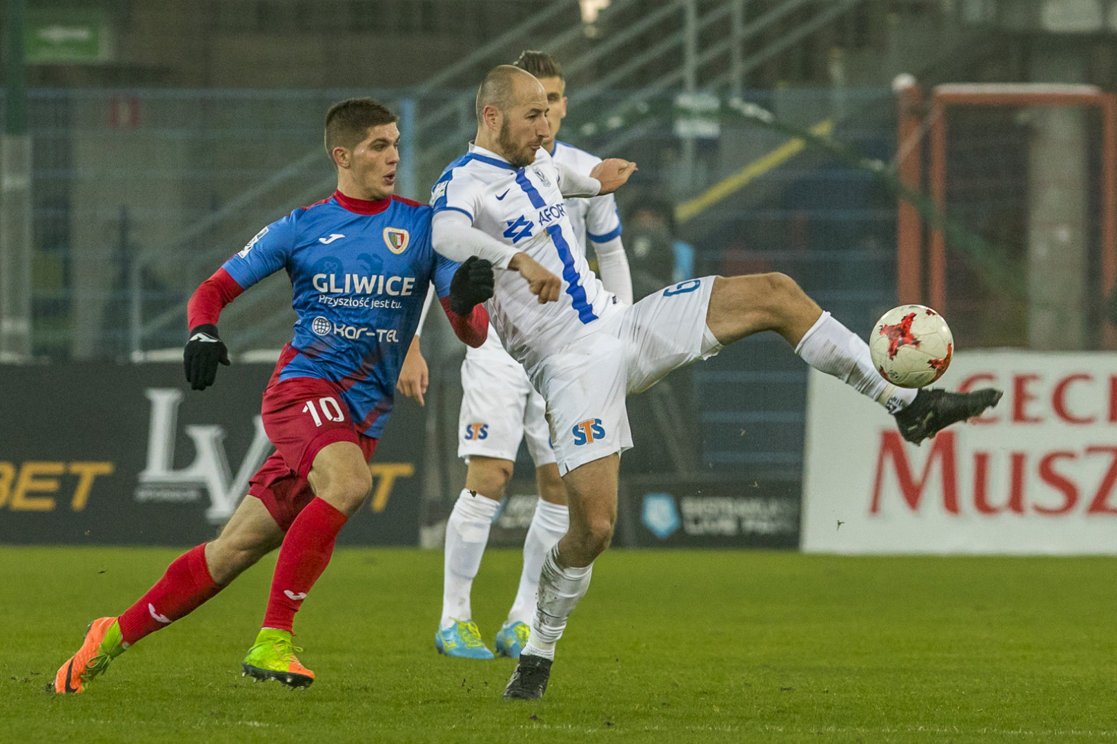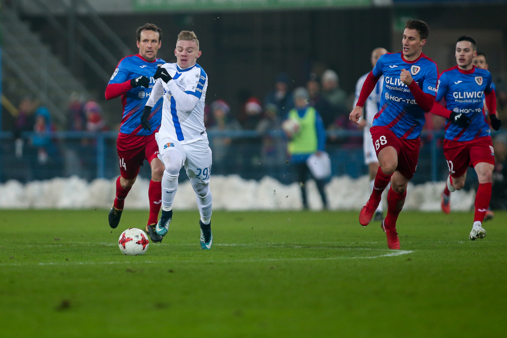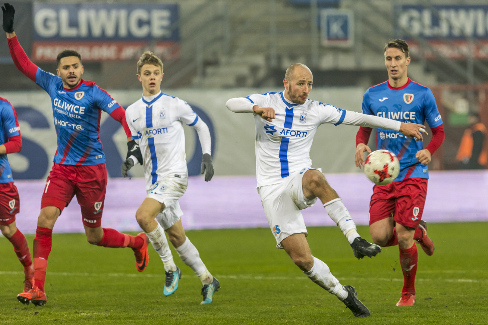 Lech seemed in control of the match, frequently visiting their rival’s penalty box. However, the team from Poznan struggled to beat Piast’s defensive line. In the 38th minute Jevtic’s great shot from outside the ball was saved by the goalkeeper. In the last offensive action of the first half, Makuszewski hit the crossbar.
