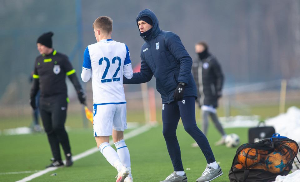 I tak też było już w pierwszych fragmentach tej konfrontacji, kiedy kilkakrotnie przeciwnik potrafił nieźle wyjść spod pressingu podopiecznych trenera Węski. Ci jednak z każdą minutą coraz bardziej dochodzili do głosu, odbierali coraz więcej piłek na połowie rywala, a te zamieniali na szybko stwarzane zagrożenie pod jego bramką. Właśnie dzięki tego typu akcji sam na sam znalazł się Sergey Krivets, ale ostatecznie nie skorzystał on z asysty Jakuba Karbownika.